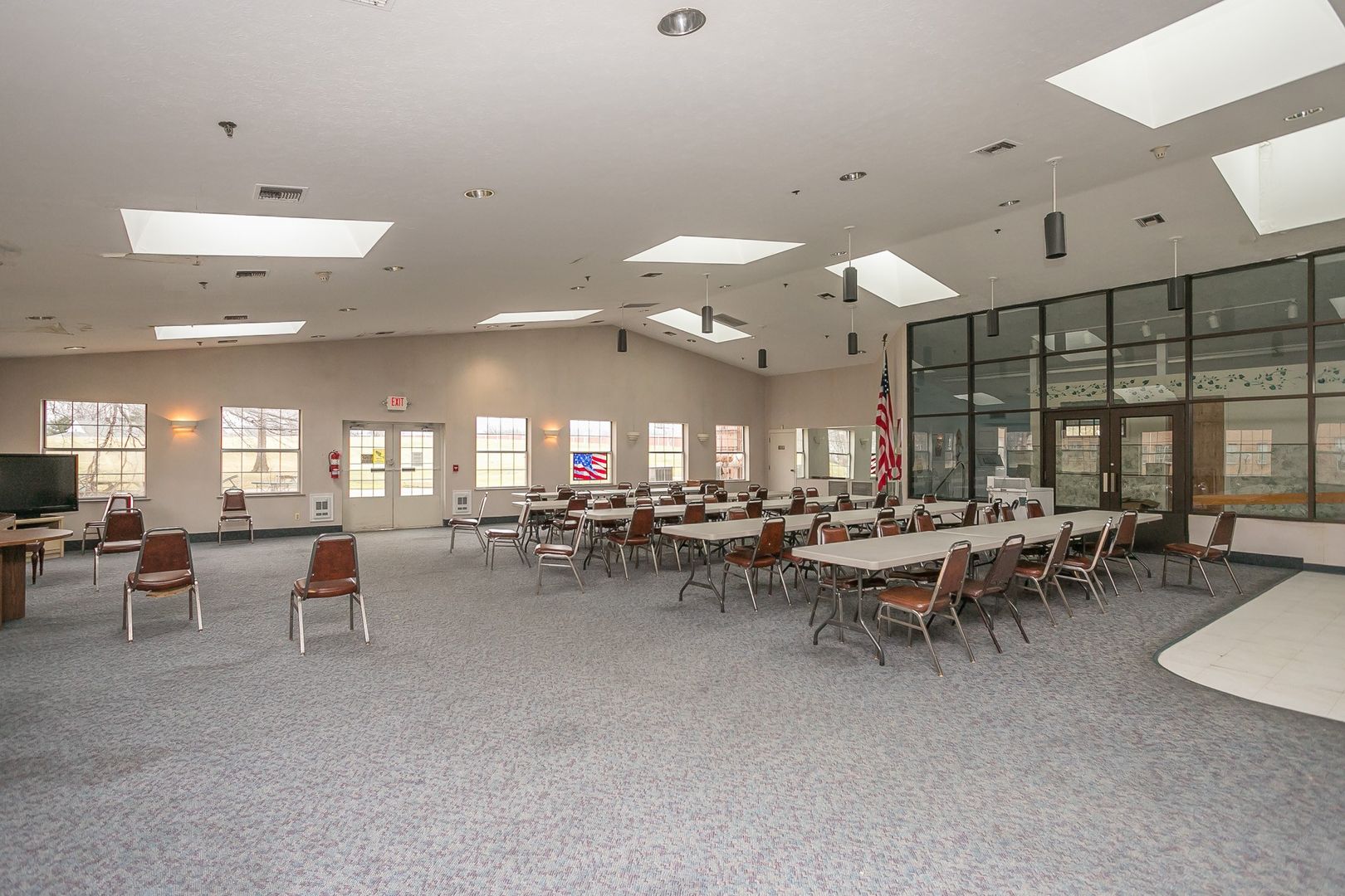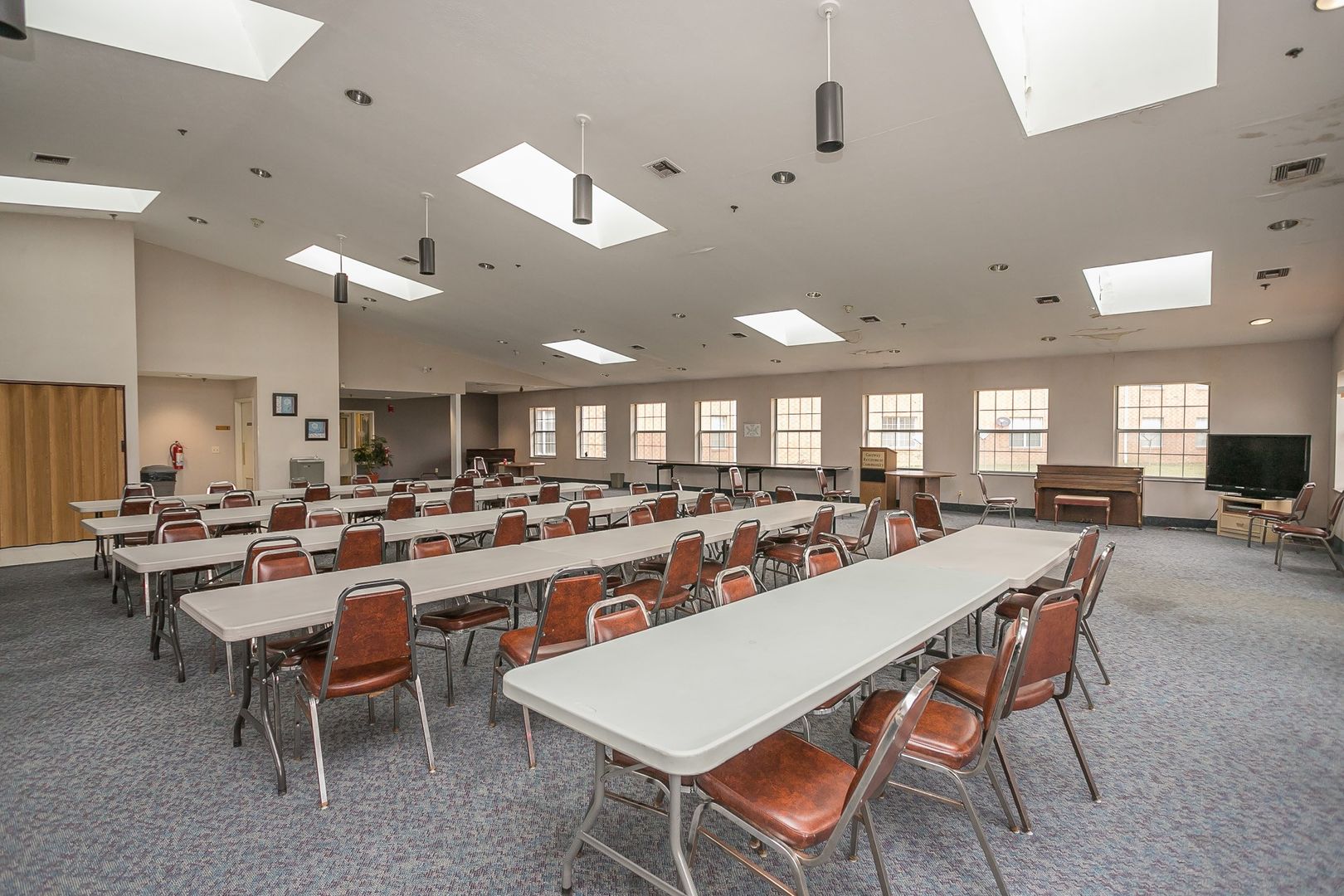 - Large gathering room with kitchenette, tables and chairs