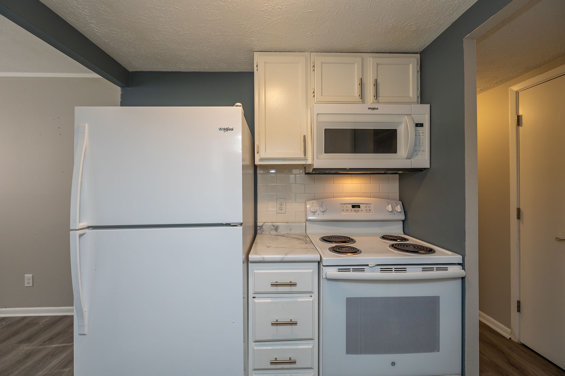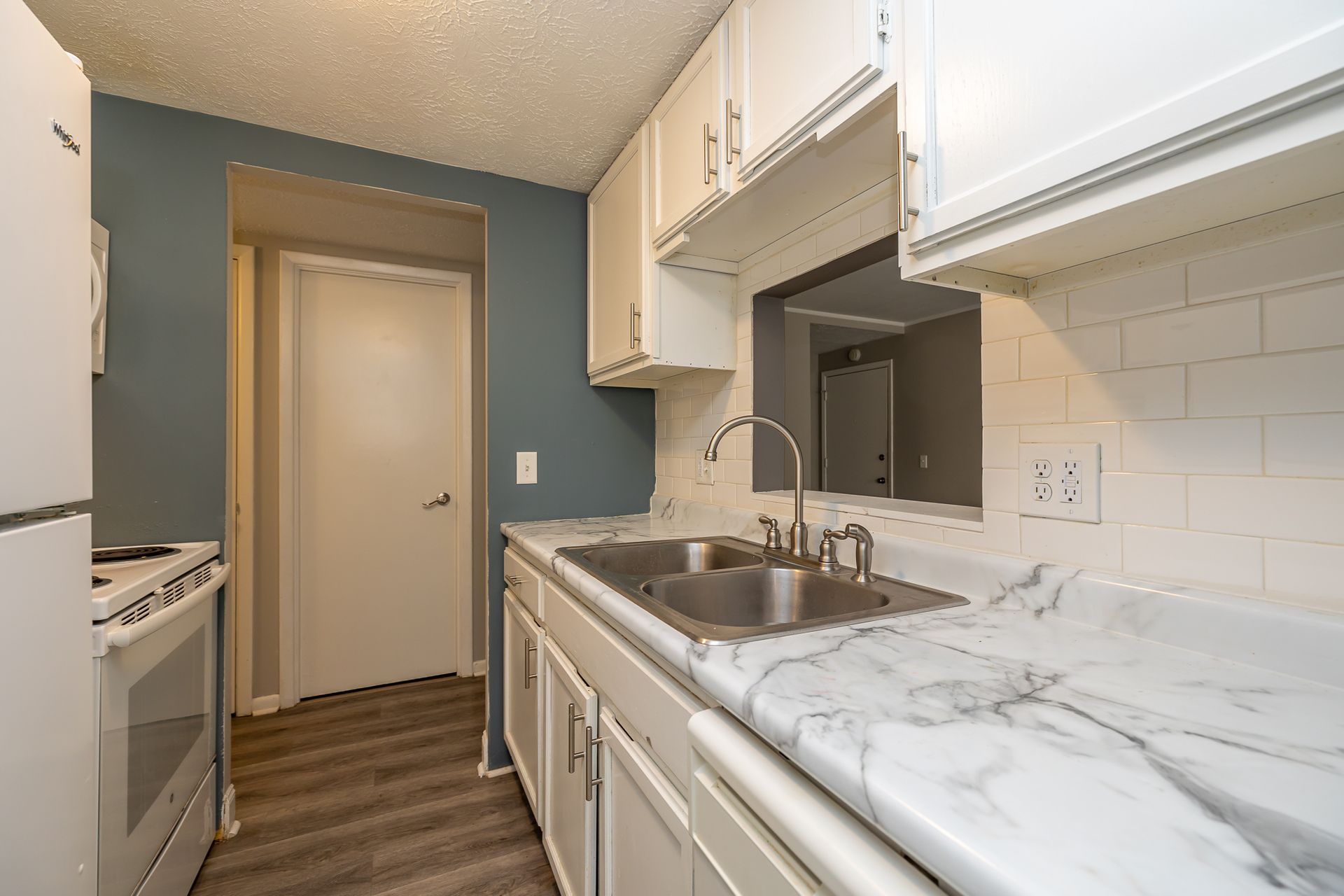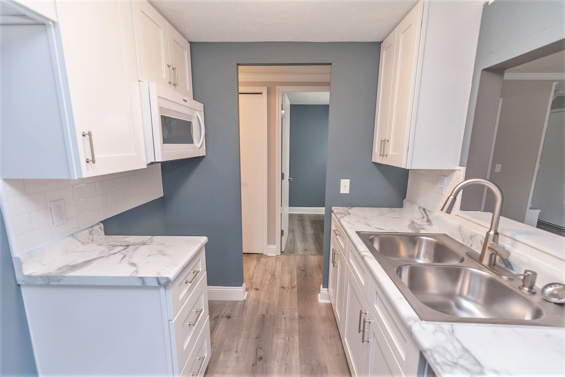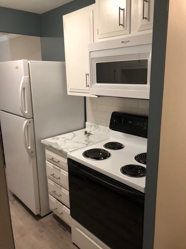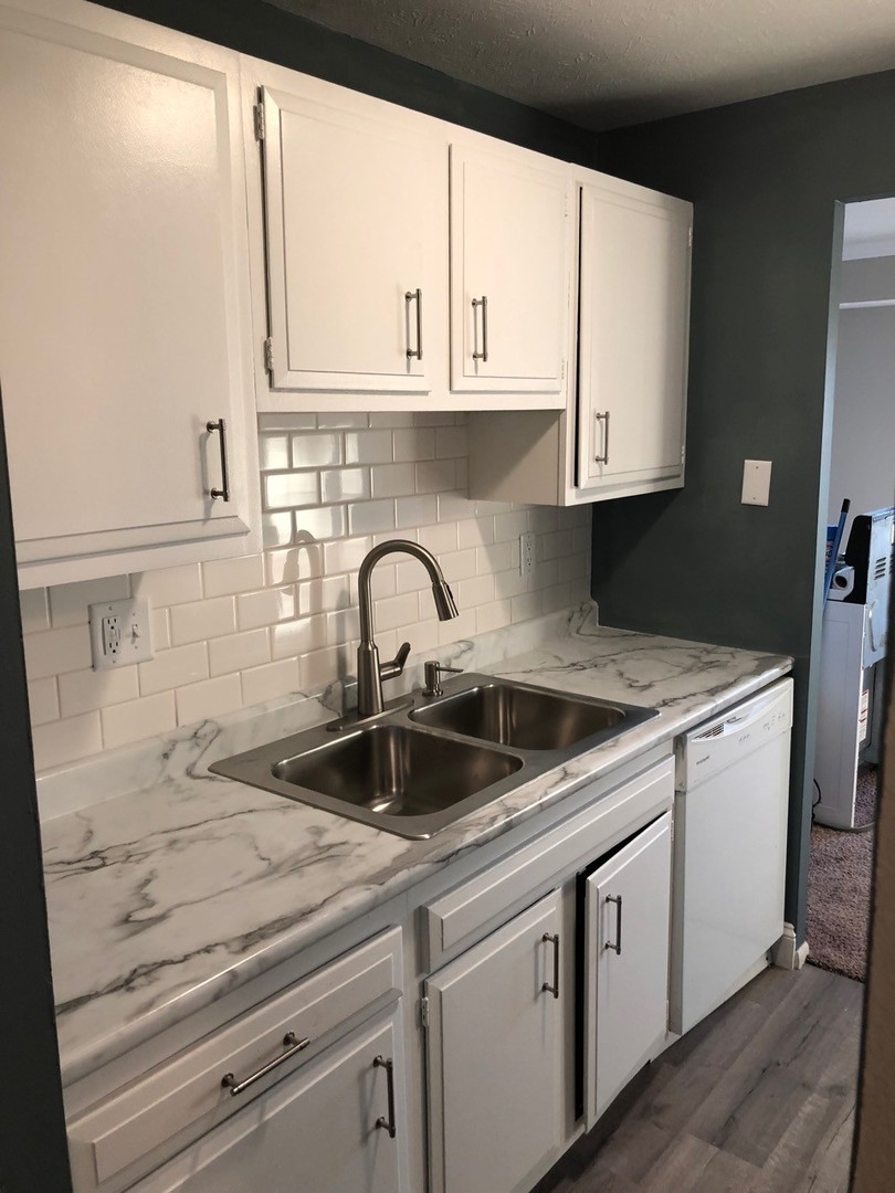 - Kitchen: New luxury vinyl flooring, faux marble countertops, double bowl sinks, dishwashers, and mounted microwaves to maximize counter space.