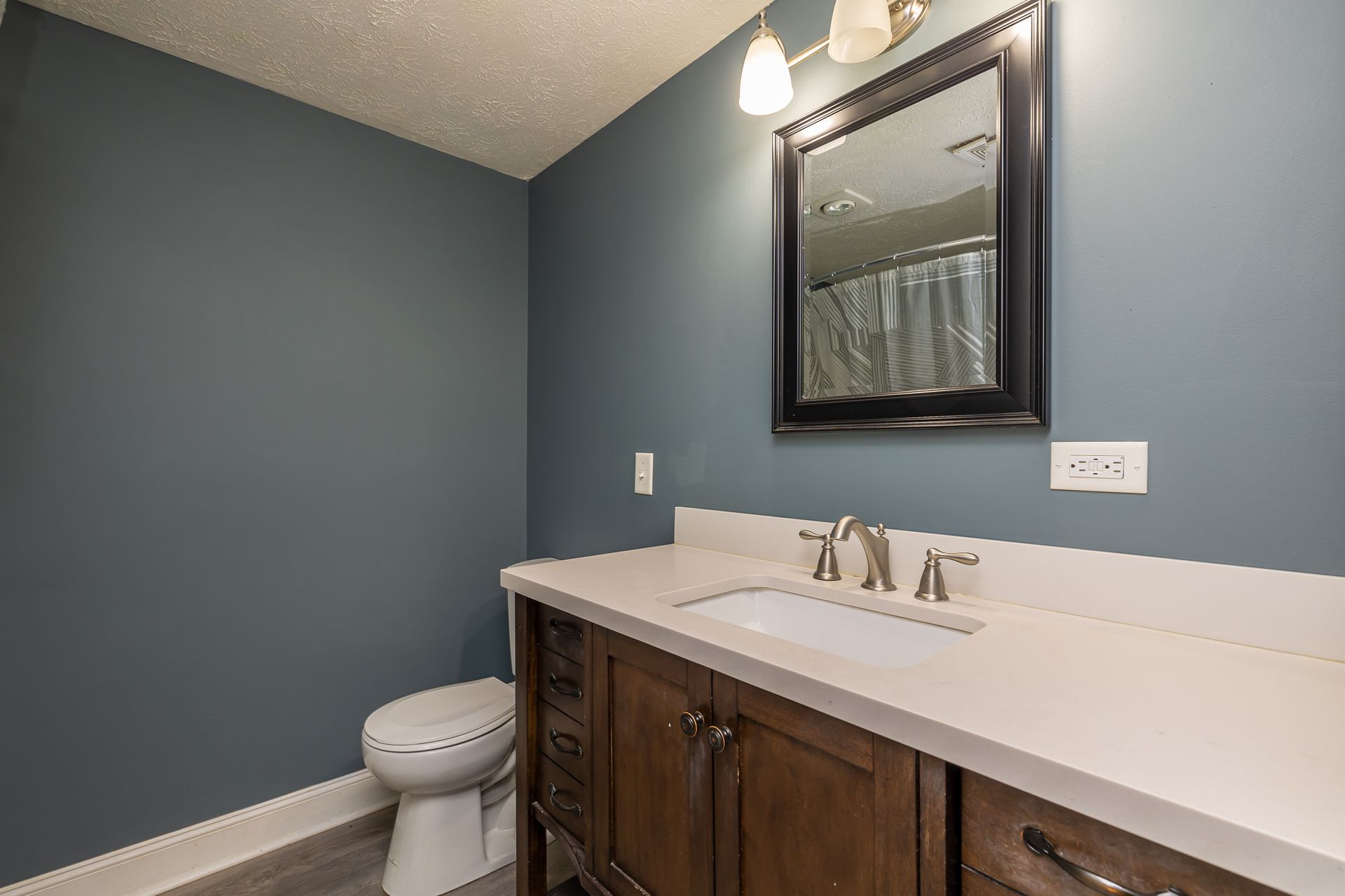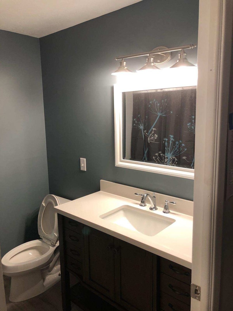- Bathroom: Fully remodeled with luxury vinyl flooring, a new 48” vanity, Moen fixtures, a curved shower rod, and a new toilet.